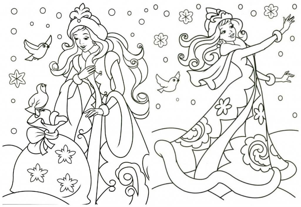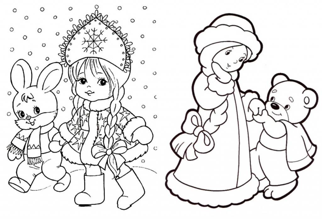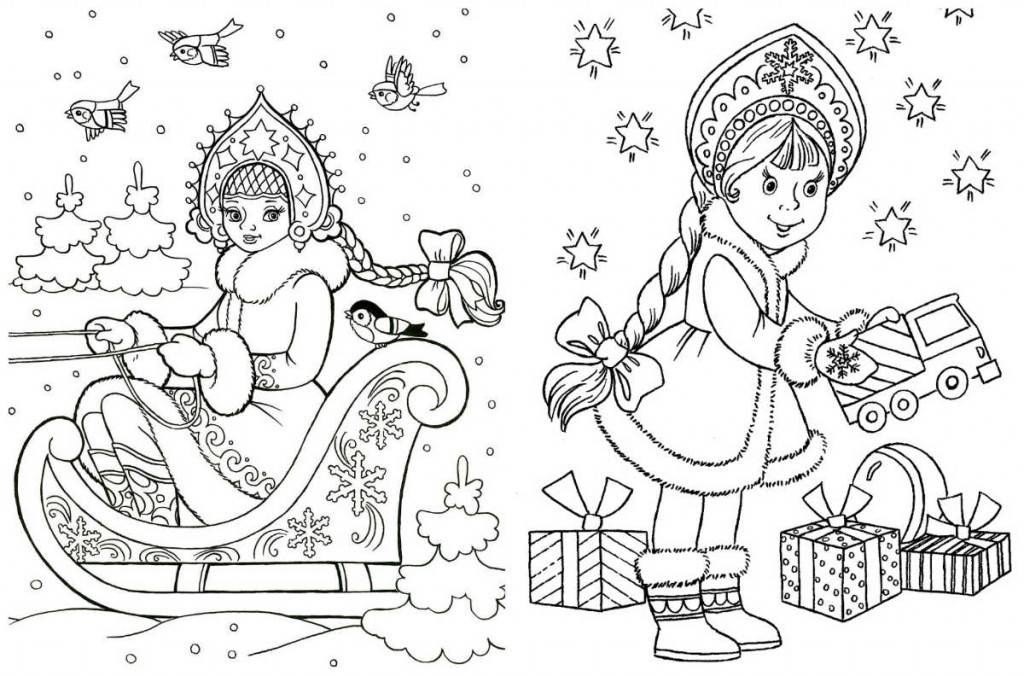 Раскраска Снегурочка в санях и на детском утреннике в честь Нового года.