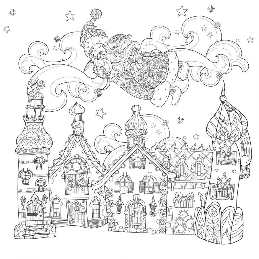А здесь нужно постараться — пряничный домик и домик сапожок для эльфов раскрашивать сложно. Здесь много деталей, поэтому лучше сначала приступить к первой картинке с широкими контурами, а потом перейти к более сложной. Ребенок может придумать по мотивам картинки свою сказку о том, кто в них живет. Готовую картинку можно покрыть блестками, приклеить пайетки или наклеить вату, будто это снежок.