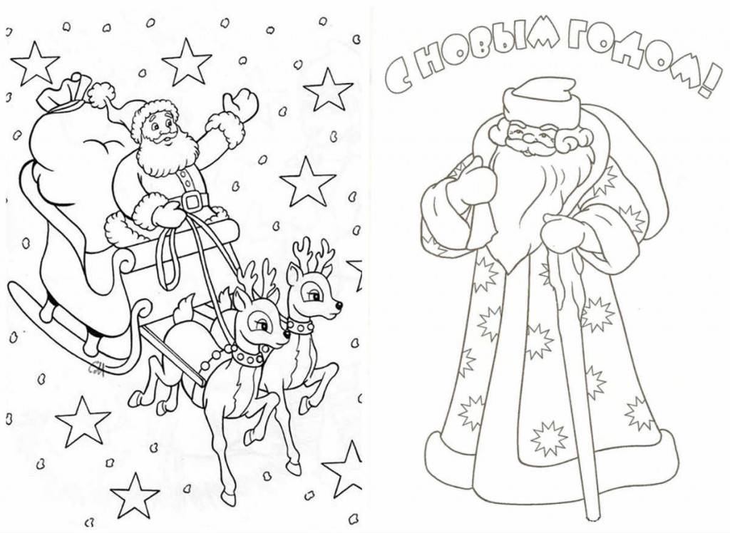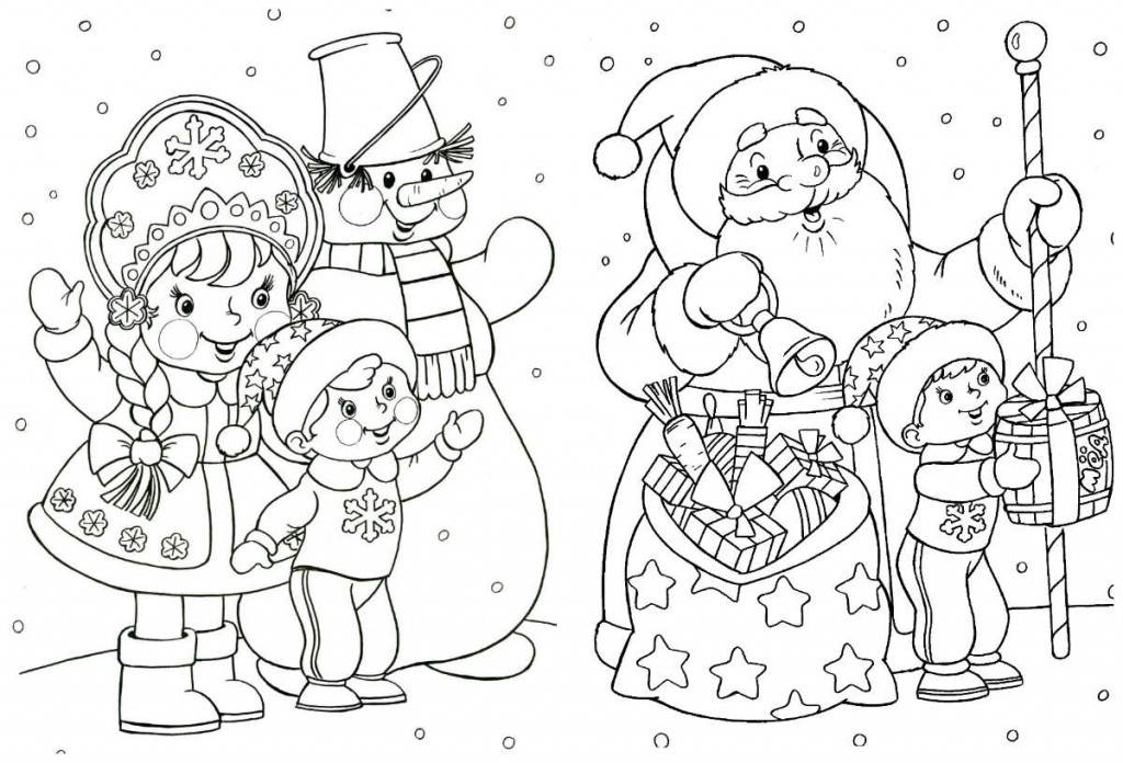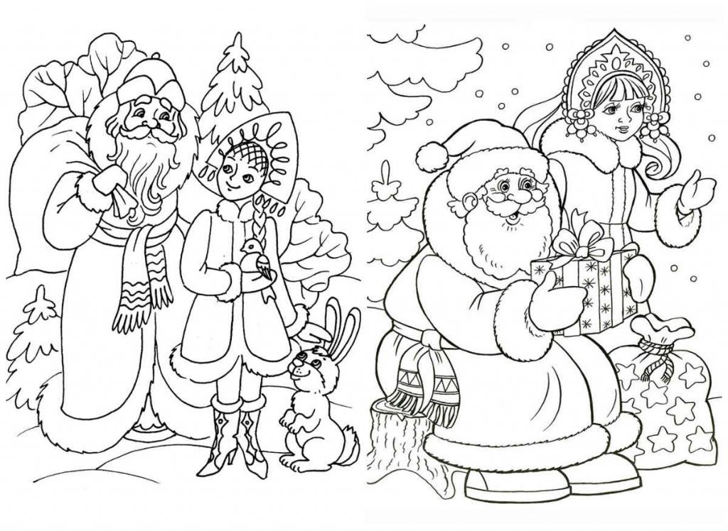 Раскраска Дед Мороз и Снегурочка приехали к ребятишкам.