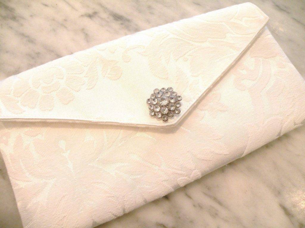 Края ткани соединяют и вшивают петлю для пуговицы или любую другую застежку. Для этого подойдет цепочка иди лента. Свадебный клатч декорируется своими руками. Для этого возьмите любые украшения, подходящие по стилю к наряду.