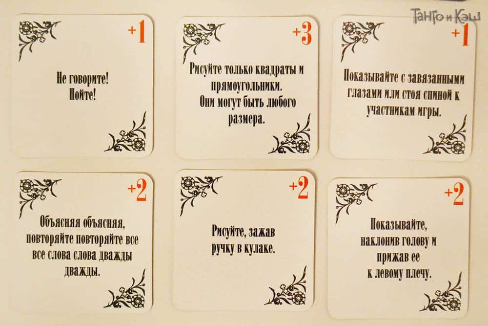 Первый, самый интересный, требует взять специальную карточку, на которой написано дополнительное условие. К примеру, “Рисуйте только круги и овалы. Они могут быть любого размера.”. Второй вариант уменьшает время для объяснения. Эти правила удобно использовать, когда слово кажется слишком простым.