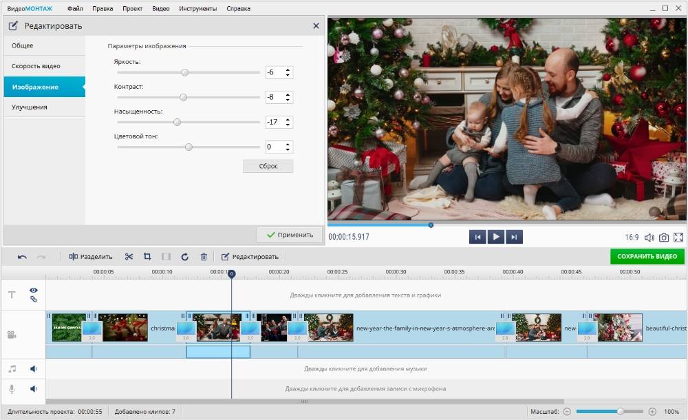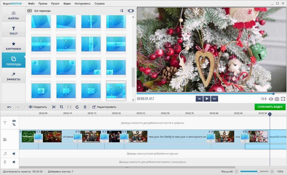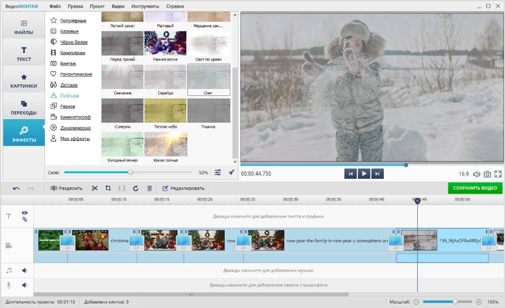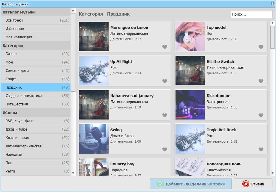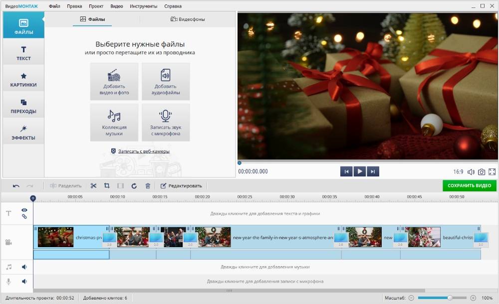 Последний штрих в праздничное настроение внесёт фоновая музыка. Можно добавлять в проект аудиофайлы как с компьютера, так и из коллекции программы. Прекрасно подойдут любимые всеми новогодние и рождественские песни. Можно пустить мелодию фоном или полностью заместить ей исходный звук.