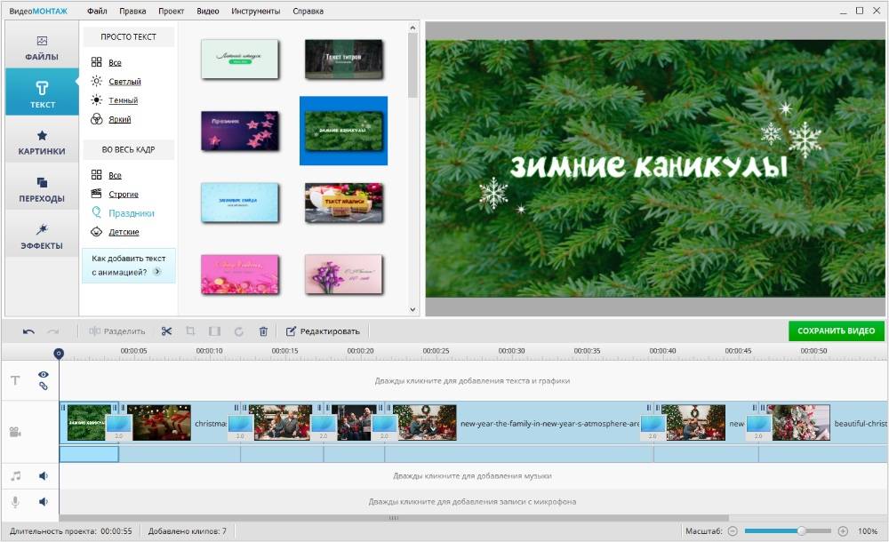 Во вкладке «Текст» можно добавлять на надписи. Перемещайте их в любое место, меняйте размер и шрифт, выбирайте любой цвет букв, устанавливайте тень и контур. Программа предлагает готовые стили текста. Подберите нарядный дизайнерский вариант, который идеально дополнит праздничную открытку, например, удачно будут смотреться варианты в новогодних красно-белых цветах. Также можно наложить красочные стикеры, способные оживить видеоряд. Это могут быть картинки из каталога программы или собственные изображения елочных игрушек, мишуры и т.п.