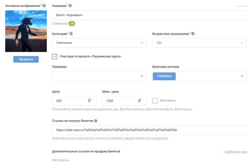 Для событий «Пушкинской карты» онлайн-продажа билетов – обязательное условие. Ссылка должна вести на событие у билетного оператора или на страницу вашего учреждения, где продаются билеты. Если продажа билетов еще закрыта, можно добавить событие на платформу, сохранив его в черновиках, и отправить на модерацию тогда, когда продажа билетов будет открыта.
