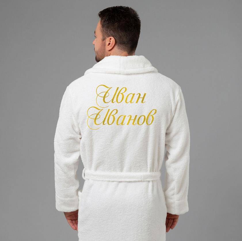 - Тёплый махровый халат, чтобы презент стал личным и дорогим для именинника, закажите его с именной надписью на спине.