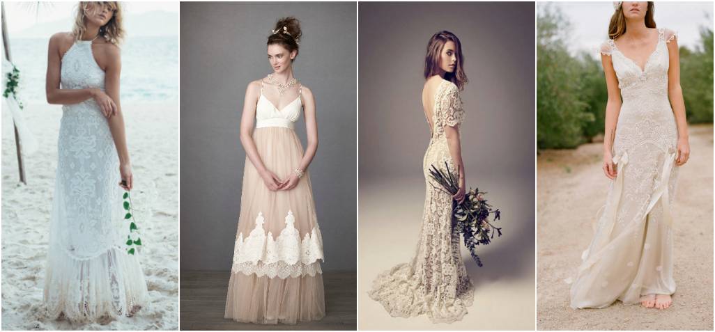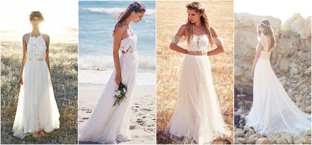 Свадебные платья в бохо-стиле с открытыми плечами, которые изготовлены из натуральных материалов (лен, хлопок), идеально впишутся в торжество на берегу
