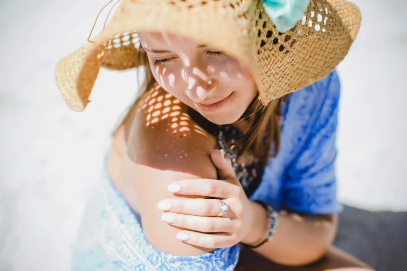 Солнце просвечивает сквозь рисунок шляпы и отбрасывает красивые тени на лицо и плечо девушки