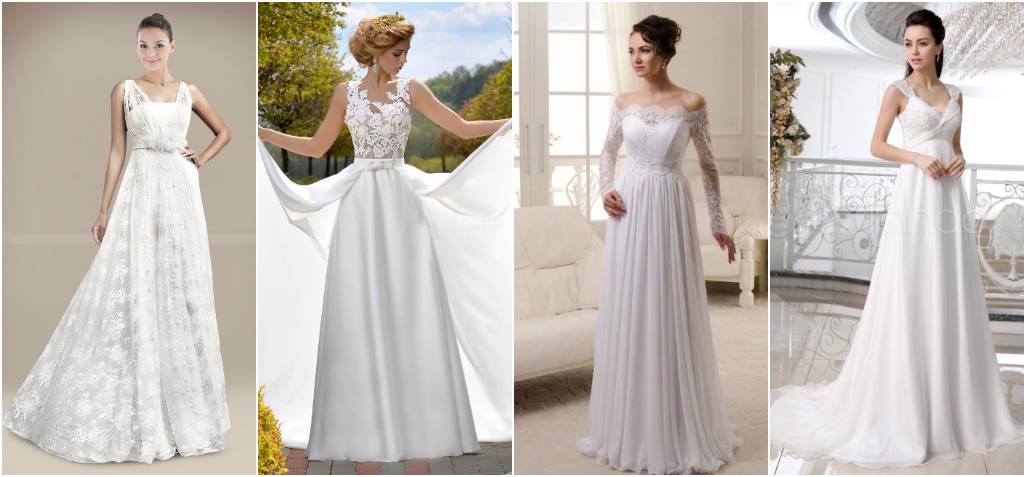Ампир: длинное платье с достаточно пышной юбкой и открытыми плечами. Такой фасон почти универсален, и худые, и полные девушки хорошо смотрятся в нем. Даже наличие широких плеч компенсируется широкой юбкой, которая визуально «уравняет» верх и низ.