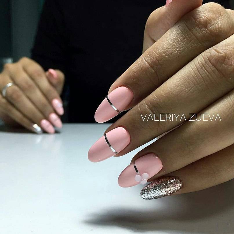 Тренд сезона — однотонное покрытие в сочетании с прозрачной базой, на которую нанесен рисунок — нежные цветы, кружево или обычные фольгированные полоски. Отлично смотрится и лунный маникюр с минималистичным выделением небольшими камнями.