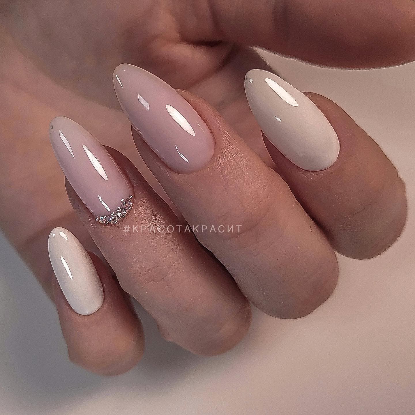 Острая форма ногтей сама по себе привлекает много внимания. Нейл-стилисты советуют оформить ее как можно проще — нюдовая база с выделением одного или двух ногтей. В качестве декора можно выбрать традиционные стразы, втирку, рисунки.
