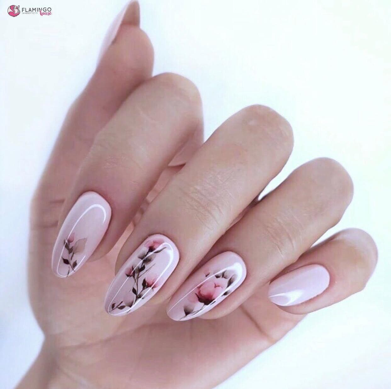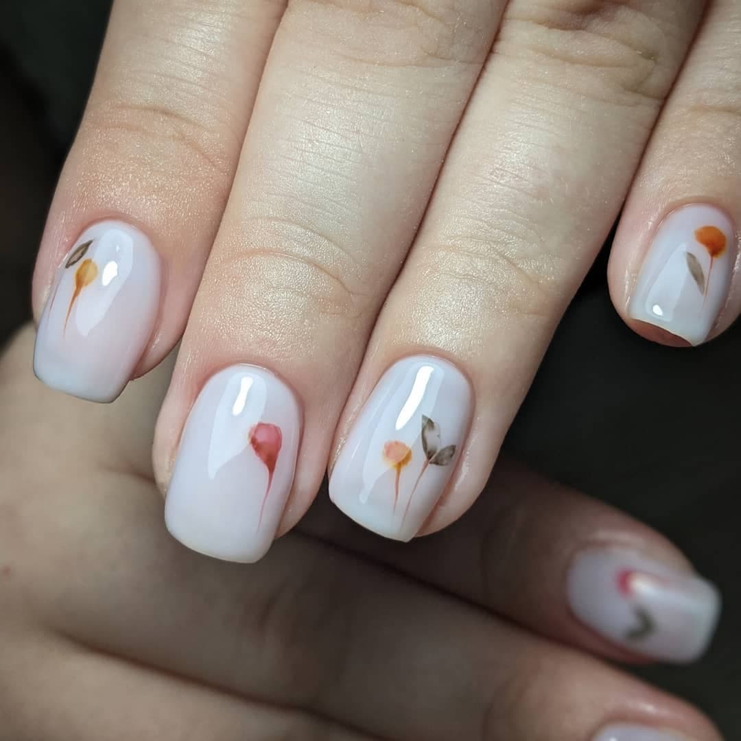 Если девушка все же являются любительницей красных цветов, возможен вариант на ногтях, окрашенных светлыми лаками, с красным узором, например, нежным и неброским цветком.
