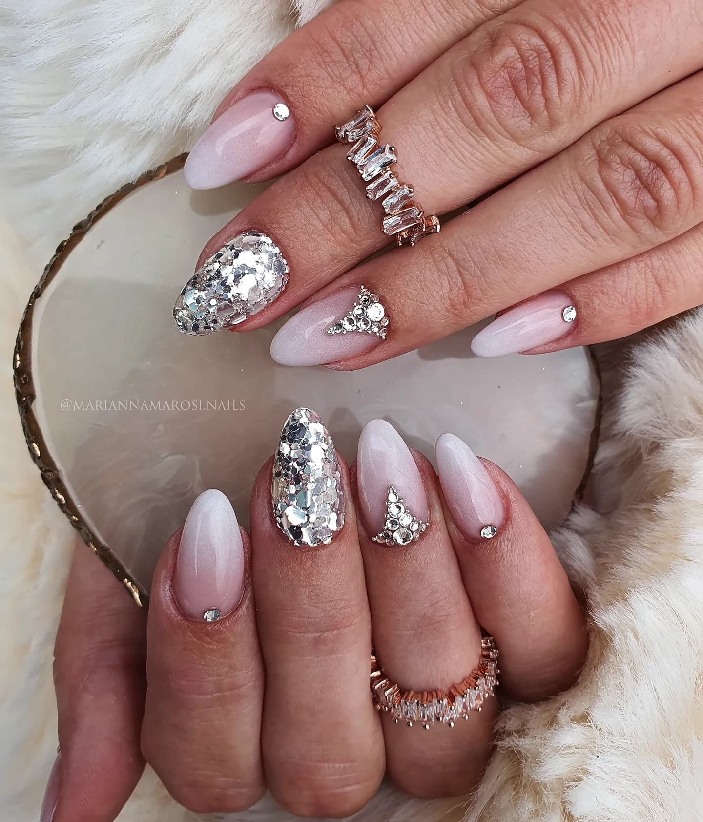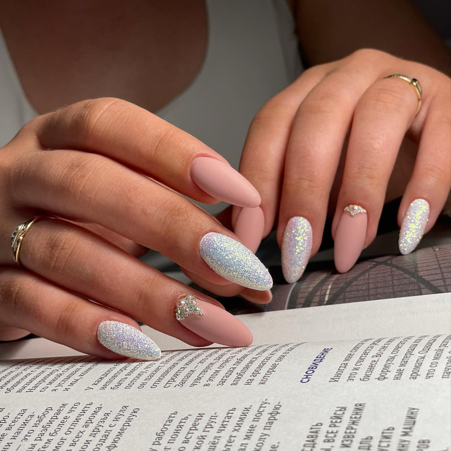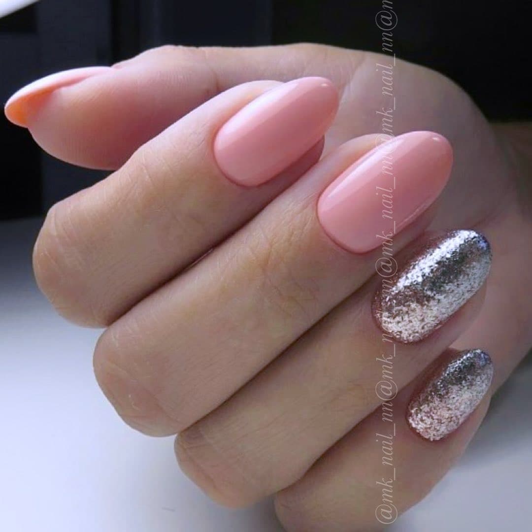 Стоит быть осторожной с глиттером — маникюр на свадьбу невесте с использованием блесток выглядит очень эффектно, но важно гармонично сочетать его с платьем. Если у твоего наряда теплый подтон — выбирай золотой глиттер, если холодный — серебряный