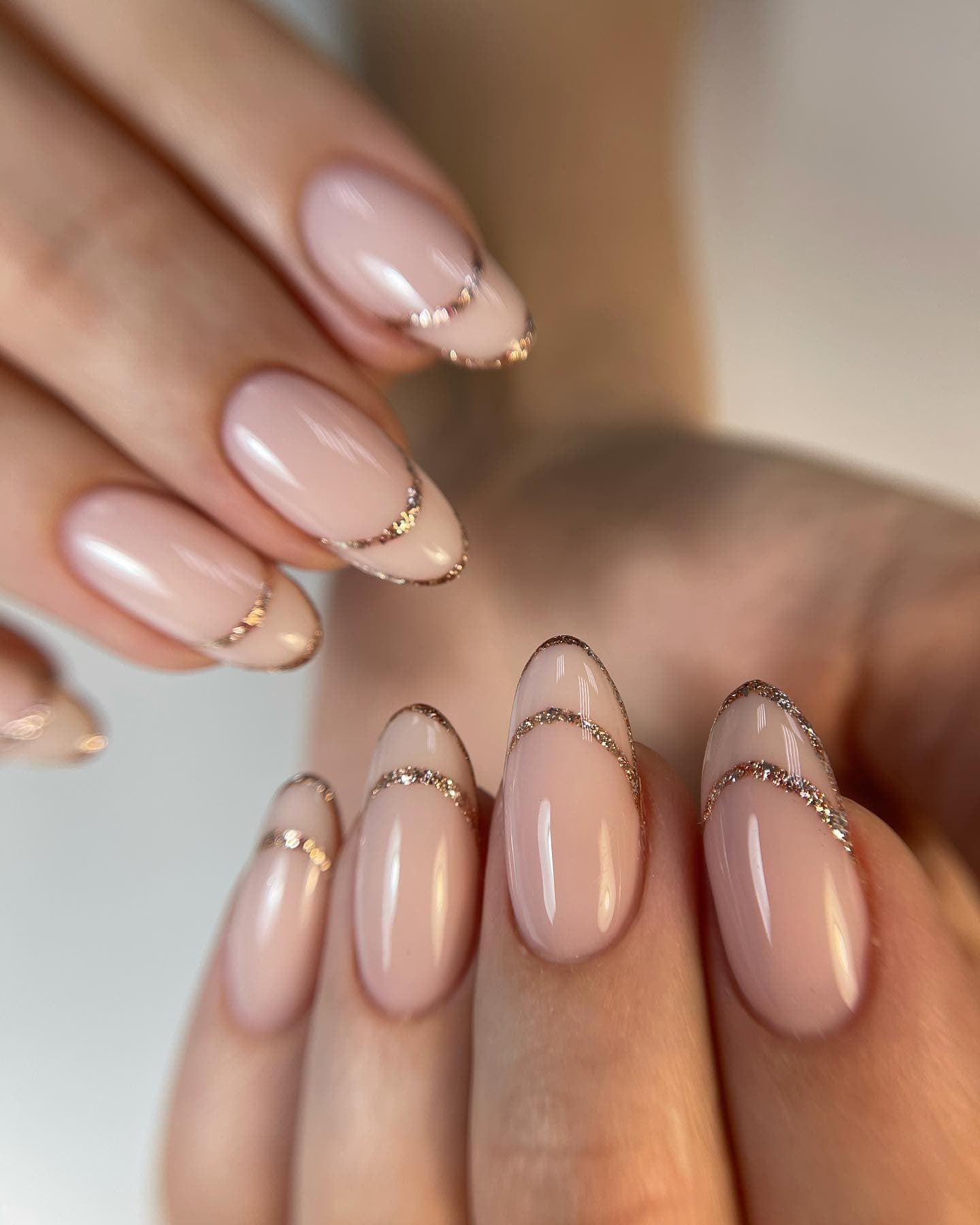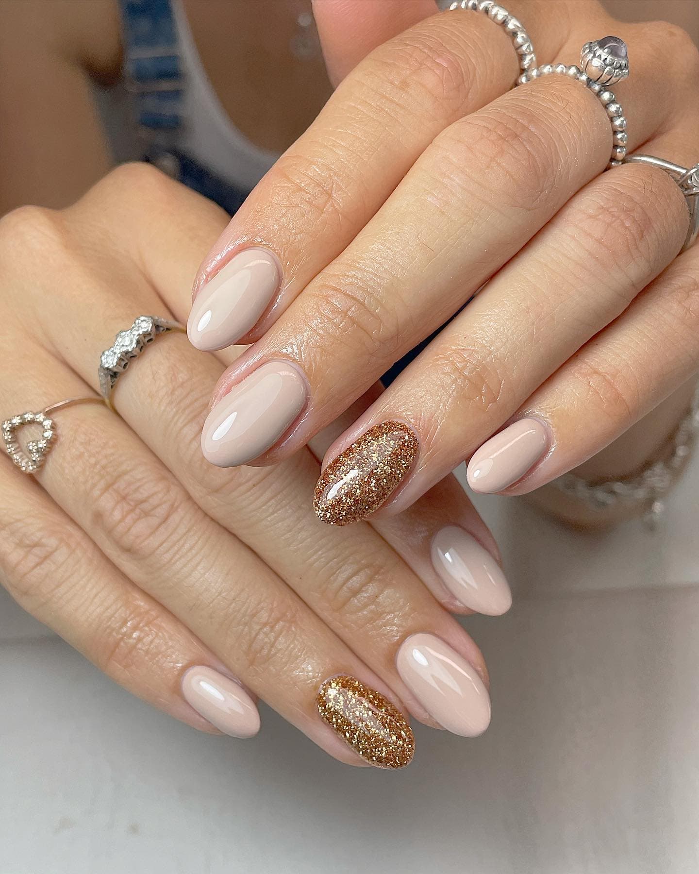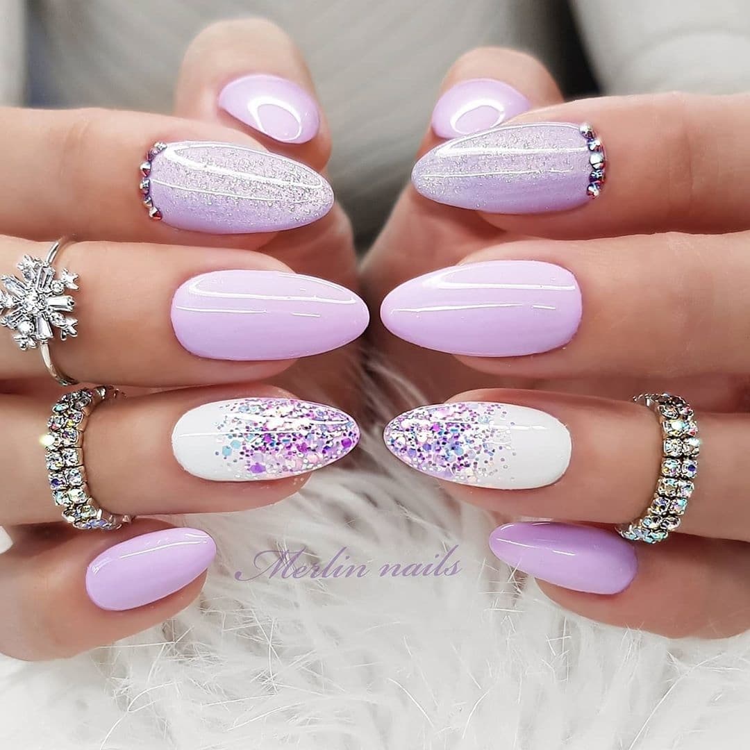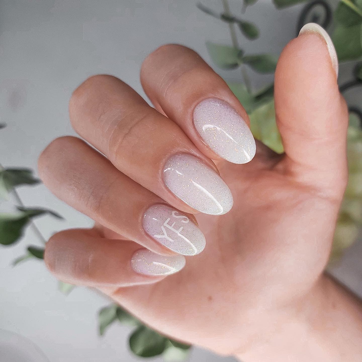 Стоит быть осторожной с глиттером — маникюр на свадьбу невесте с использованием блесток выглядит очень эффектно, но важно гармонично сочетать его с платьем. Если у твоего наряда теплый подтон — выбирай золотой глиттер, если холодный — серебряный
