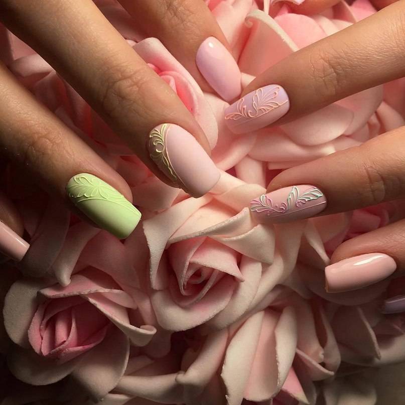 Лидирующими в области цветовой палитры являются пастельные оттенки. В нынешнем году не стоит ограничиваться тандемом белого лака с бежевым цветом. Можно использовать песочные, розовые, голубые лаки и оттенки персика, лаванды, мяты, молочные тона. Разбавить такой маникюр можно золотистым и серебристым цветом.