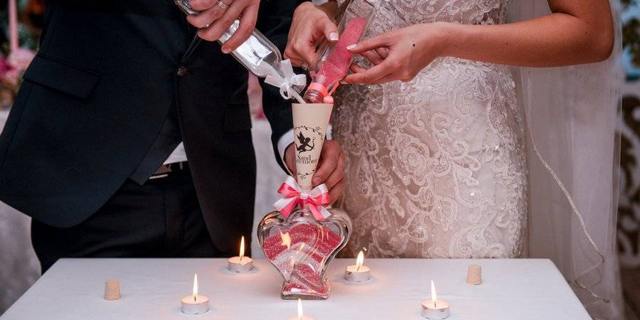 Если хочется наполнить свое торжество современными эффектными традициями, то не оставляйте без внимания и песочную свадебную церемонию. Ведь она не потребует много затрат, зато останется в памяти молодых на всю жизнь, а сосуд с красивым узором, сделанным собственноручно, будет украшать Ваше семейное гнездышко и радовать глаз.