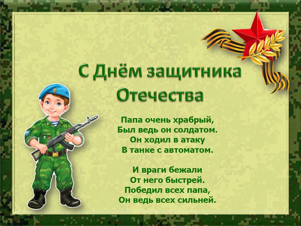 Мы вас поздравляем, защитники наши! Желаем успехов, везенья в любви, Здоровья и бодрости тем, кто постарше, Чтоб в жизнь воплотили все планы свои!