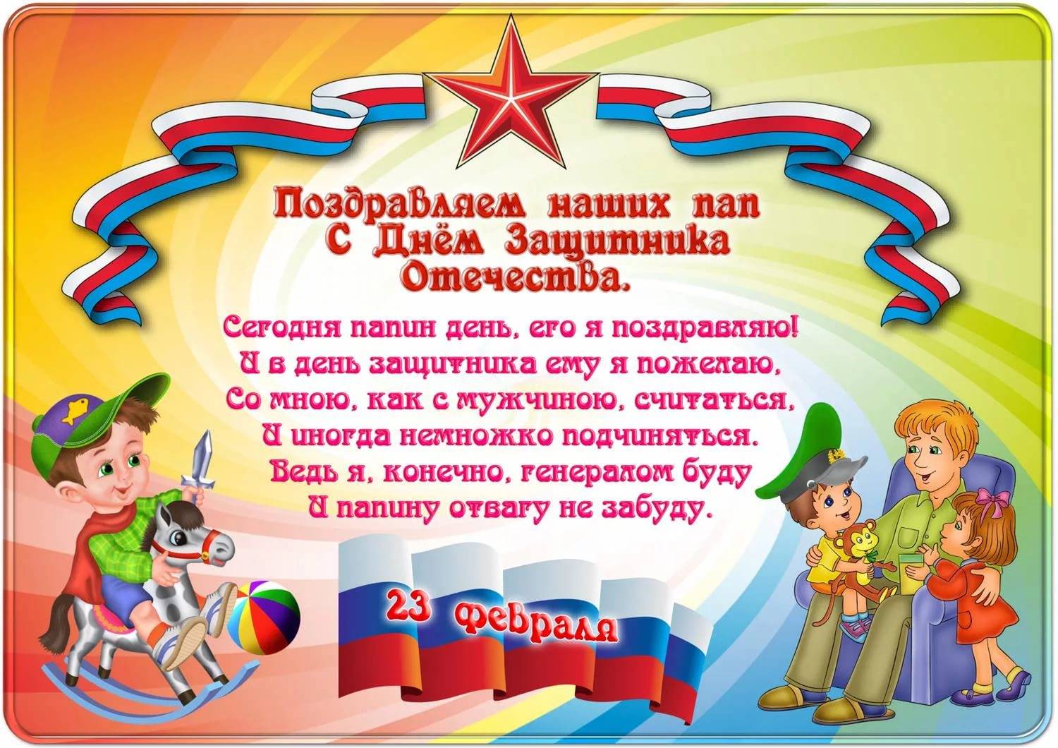 Мужчин поздравить поспешим, Мы ими очень дорожим И двадцать третье февраля, Для вас придумали не зря! За вами мы, как за стеной: Великой, каменной, большой! Спокойно можем в мире жить, Когда уходите служить! Оберегая наш покой, Сильны вы телом и душой! Сердечно мы вас поздравляем, Во всём успеха вам желаем! На вас мы можем положиться, Мужчинами страна гордится! Мы вас, родные, обожаем, Всем коллективом поздравляем!