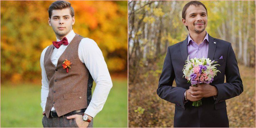 Интересно на женихе в такую пору выглядит – теплая жилетка, кардиган или свитер. Если же на улице будет совсем холодно, то для фотосессии на свежем воздухе уместно накинуть пальто.