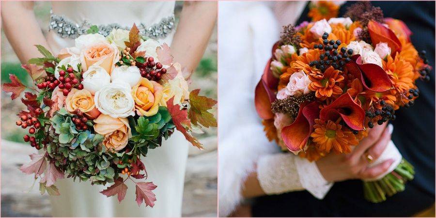 - осенние виды цветов и декора в букете невесты;