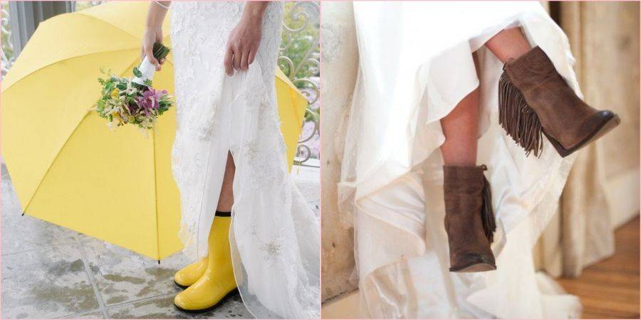 Лучше всего отдать предпочтение закрытым моделям. Необычно будут смотреться кеды в сочетании с пышным платьем. Основная задача обуви – сохранить ноги сухими даже в случае неожиданного погодного сюрприза. Идея с одинаковым стилем сапог для жениха и невесты прекрасно дополнит осеннюю фотосессию.