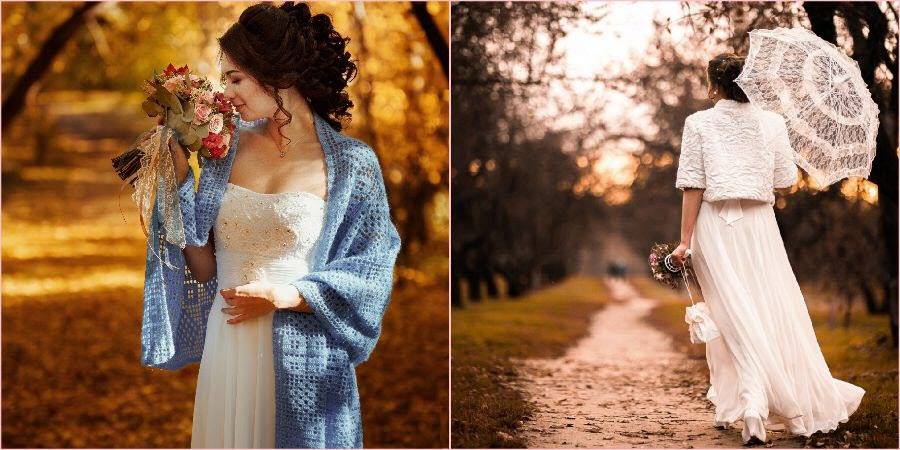 При его выборе нужно учитывать, что осенняя погода капризна и переменчива, и от дождя никто не застрахован. Короткое платье – от середины голени до колена – не боится грязи. А любительницы длинных нарядов могут выбрать альтернативный вариант – корсет и 2 юбки к нему (основная и запасная). Для защиты от холода лучше всего приобрести меховую накидку, болеро или шаль.