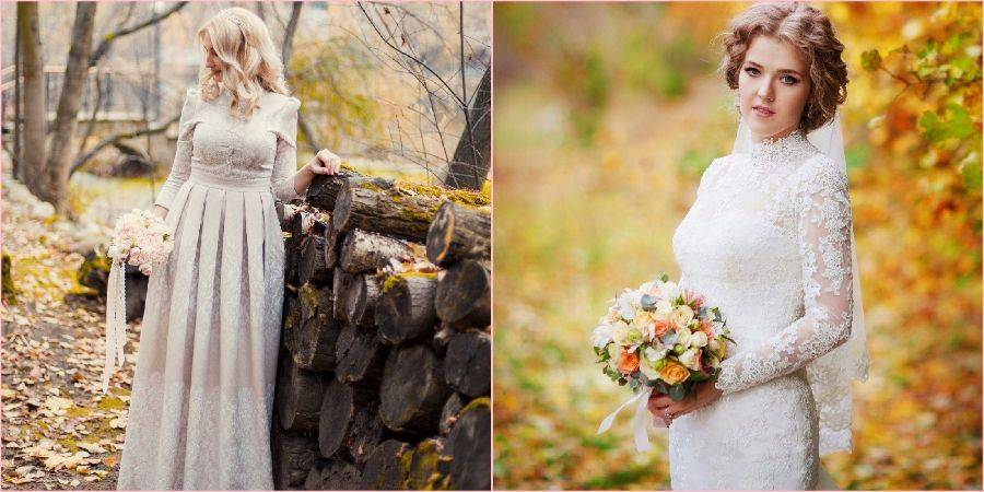 Осень — идеальная пора для платьев с длинными, красивыми рукавами. Можно выбрать для осенней стилистики платье невесты в английском стиле. В данной стране молодым девушки традиционно не оголяют руки во время свадьбы. В качестве возможных альтернатив можно рассмотреть такие варианты платьев: