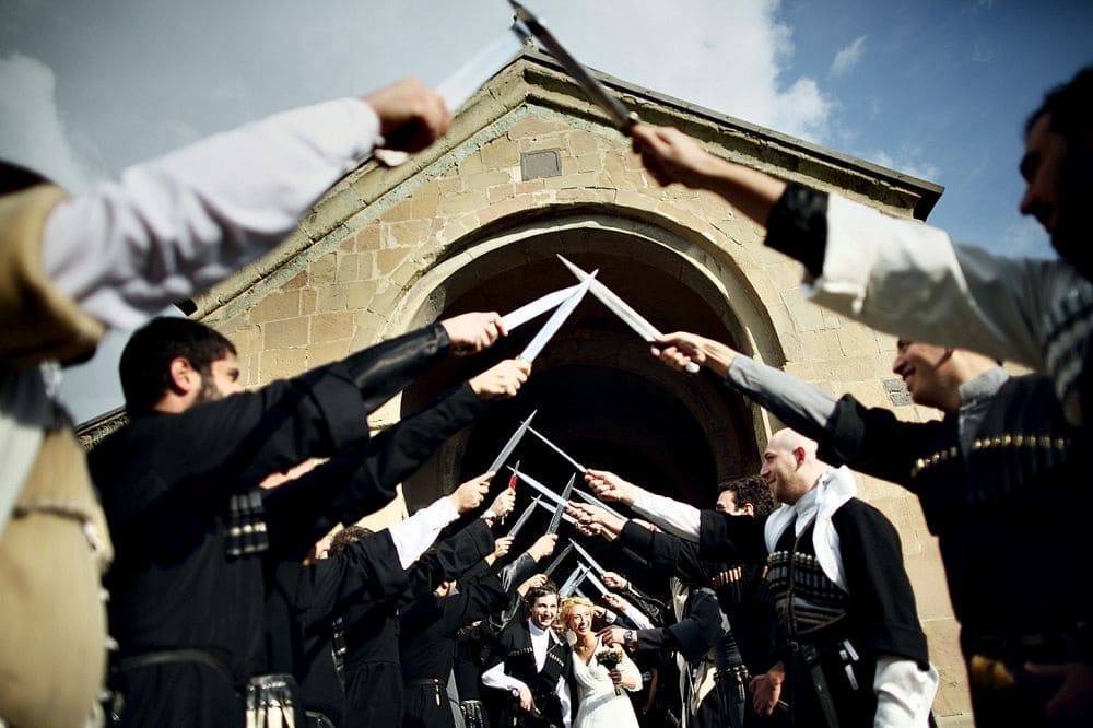 Венчание в Грузии происходит после того, как жених заберет невесту из своего родного дома. До сих пор религиозный обряд играет значительную роль в жизни грузин и к нему прибегают в 95 случаях из 100. Иногда после завершения венчания можно увидеть удивительное зрелище: друзья жениха выстраиваются в колонну по двое возле входа в церковь и поднимают вверх кинжалы. Проходя под аркой из кинжалов, молодые приобретают защиту для своей семьи.