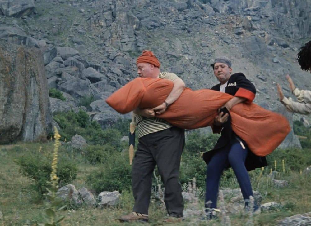 Традиция похищения невесты замечательно показана в фильме «Кавказская пленница»Кадр из фильма с Юрием Никулиным и Евгений Моргунов