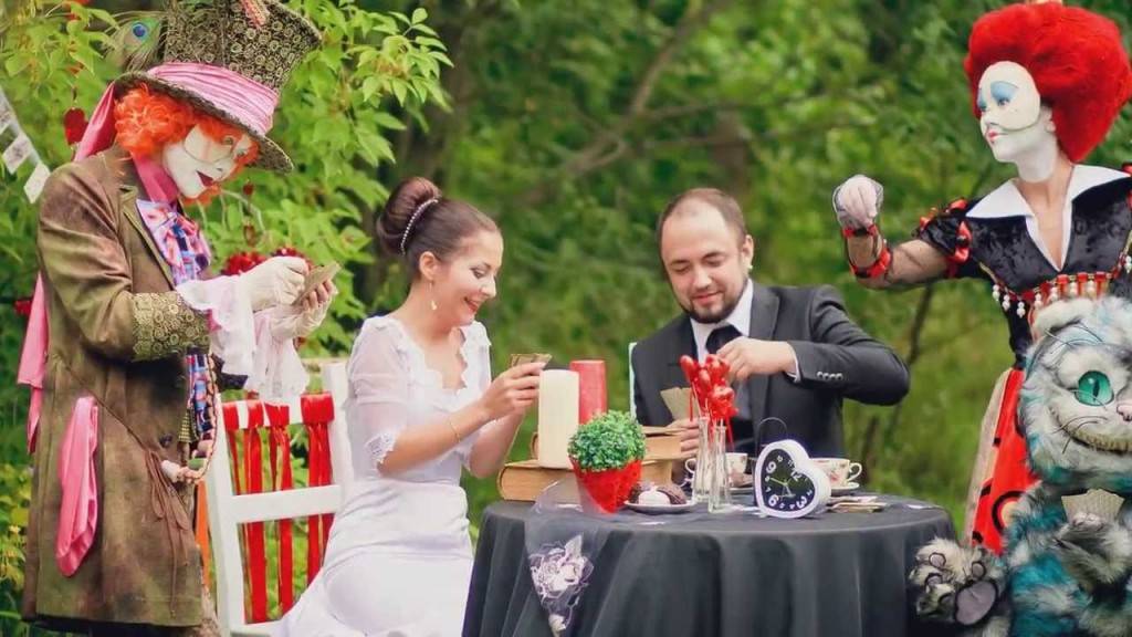 «Алиса в стране чудес». Эта тема пользуется популярностью из-за любимой всеми истории про девочку, попавшую в волшебную страну. Организовывать такую свадьбу очень интересно, и костюмов можно найти великое множество: Шляпник, Кролик, Чеширский Кот, королева. Можно просто одеться ярко и необычно. Декор также дает простор для фантазии: чем больше непонятных, ярких и больших предметов, тем лучше. На невесте будет прекрасно смотреться короткое платье, милый ободок и белые чулки.
