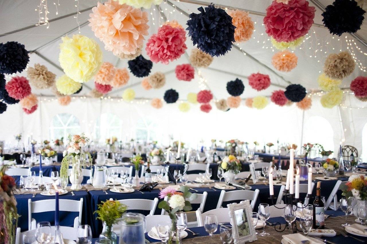 Бюджетным вариантом для украшения свадьбы являются помпоны. Пушистые и воздушные декорации сделают свадебное торжество стильным и прекрасным. С помощью помпонов молодожены смогут украсить потолок, арку, стены, колонны банкетного зала. Декорации можете размещать одиночно или собрать в большое панно, которое станет украшением для заднего фона стола новобрачных.