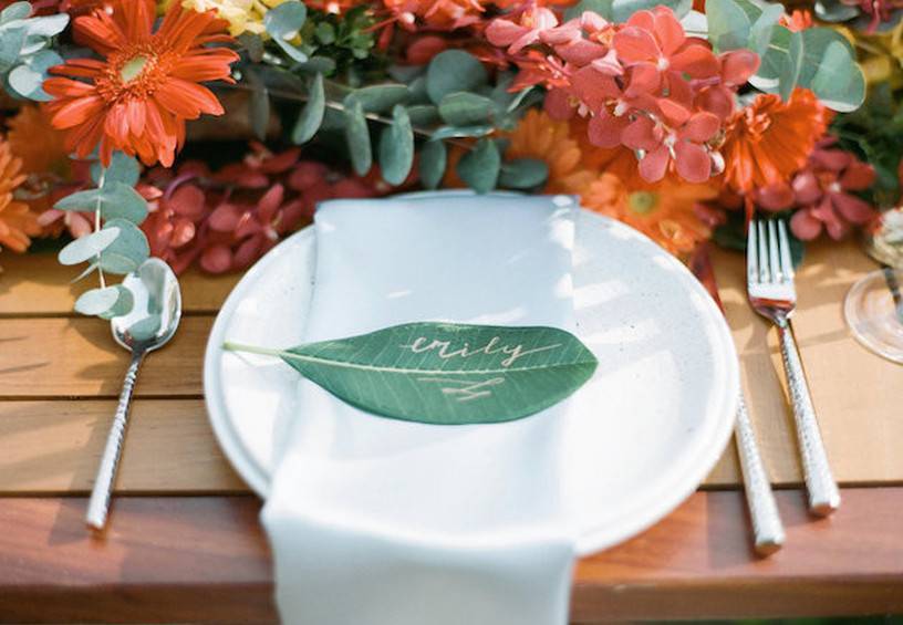 Если положение гостей за самим столом также играет роль, то на каждом месте стоит оставить карточку рассадки. Они могут быть как классическими бумажными, так и более оригинальными по дизайну: имя гостя можно оставить на каком-нибудь фрукте, фотопленке или бирочке на подарке.