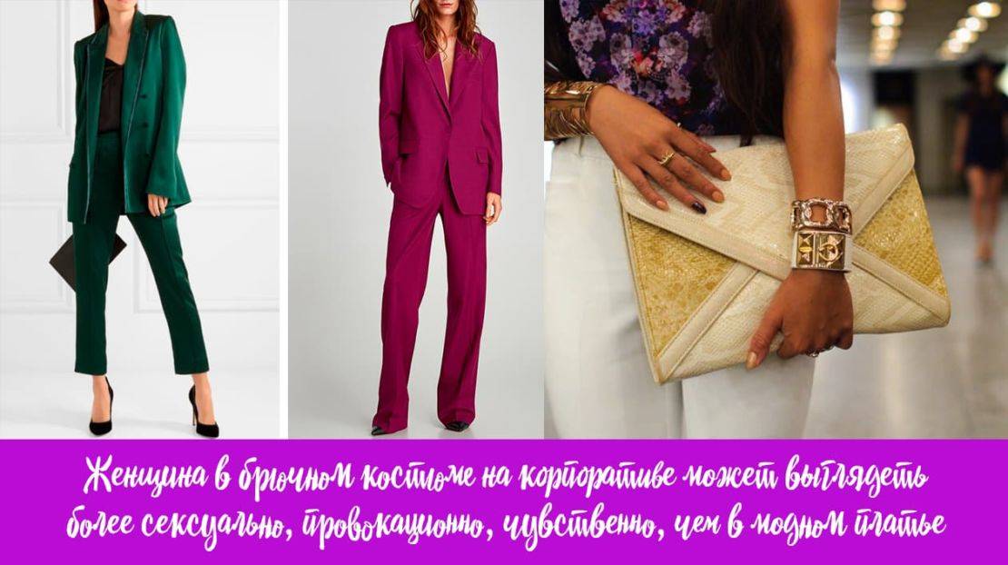 Женщина в брючном костюме на корпоративе может выглядеть более сексуально, провокационно, чувственно, чем в модном платье, и при этом никто не упрекнет ее в чрезмерной откровенности наряда.