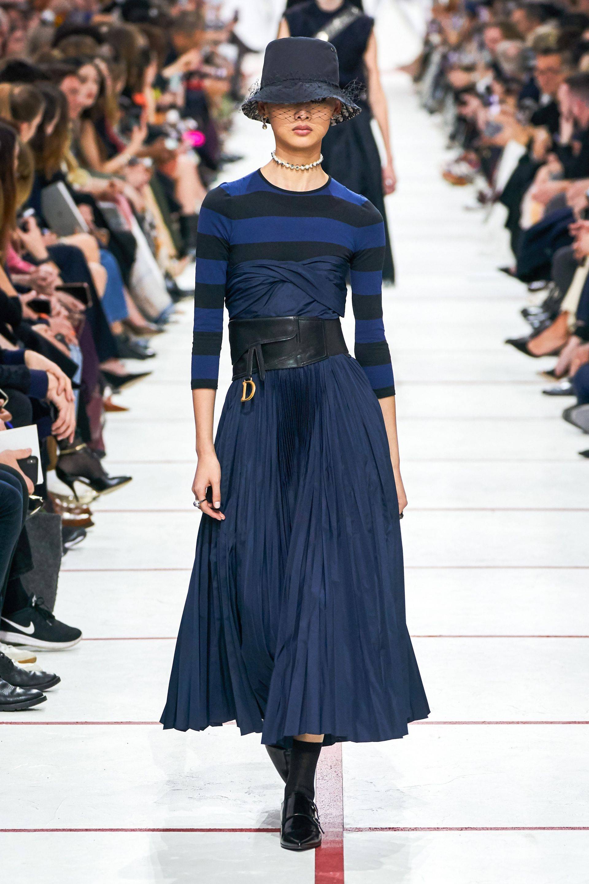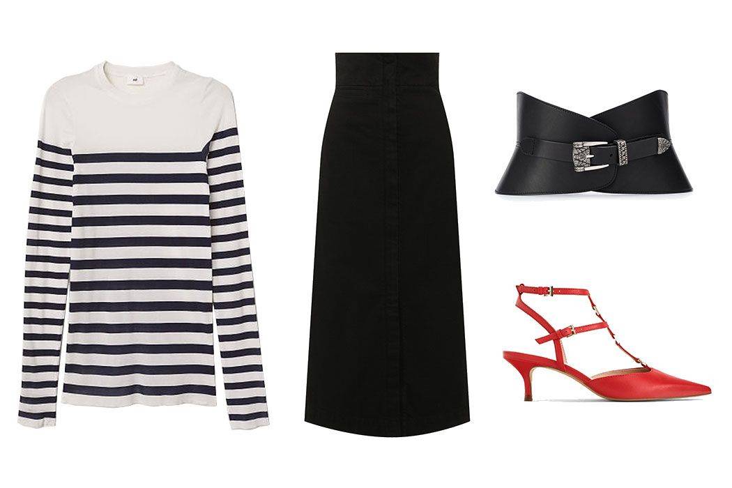 Воспользуйтесь тем, что сейчас в моду снова вернулись широкие ремни, и скомбинируйте с помощью этого аксессуара две вещи, которые точно уже есть у вас в шкафу: базовый трикотажный топ (наш выбор – лонгслив) и юбку-миди. Стоит прибавить полоску, как у Dior, и черный низ, так получится образ во французском стиле.
