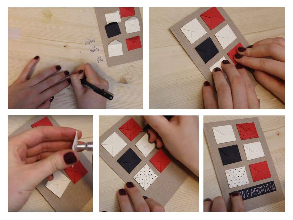 У меня есть для вас две идеи открыток. Выполняются они в техники аппликации и труда составить не должны. Первая открытка будет из конвертиков с пожеланиями, а вторая — иллюстрация банки и стеклянного колпака с сердечками. Давайте начнем.