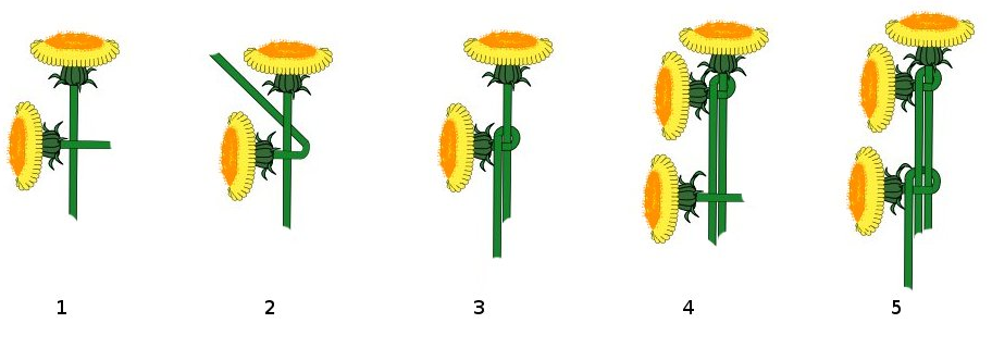 Для данного плетения потребуются живые цветы, удобней всего плести из полевых цветов, но можно рискнуть и сплести из любых других. Стебли цветов должны быть не короткие и все одинаковой длины, от 7 до 10 сантиметров. Необходимо предварительно освободить стебли от листьев. Дальнейшие действия: