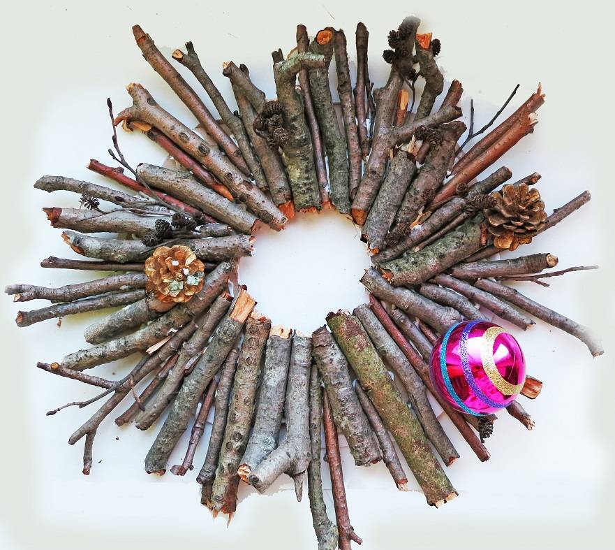 Изготовить второй венок еще проще,чем первый. Для него требуются тонкие сосновые ветки и проволока. Ветки просто сворачивают в кольцо, сплетая между собой, и закрепляя проволокой торчащие концы. Украшают венок еловыми шишками и ветками рябины.