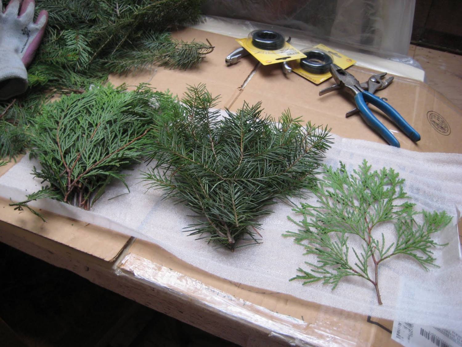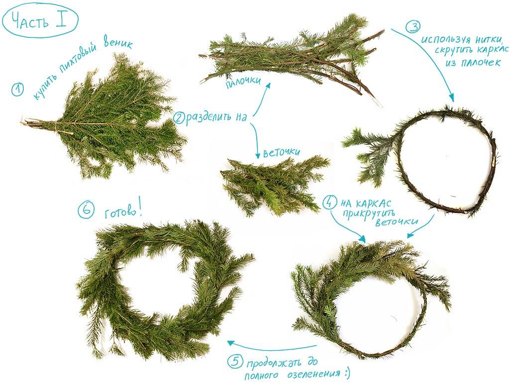 Далее следует разобрать хвойные ветки на пучки. Прикрепить их проволокой к кольцу таким образом, чтобы каждый новый пучок прикрывал место крепления предыдущего.