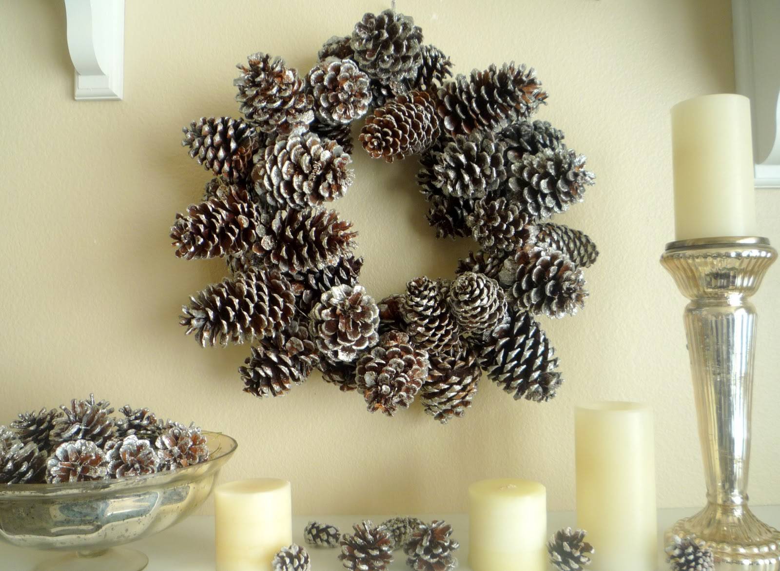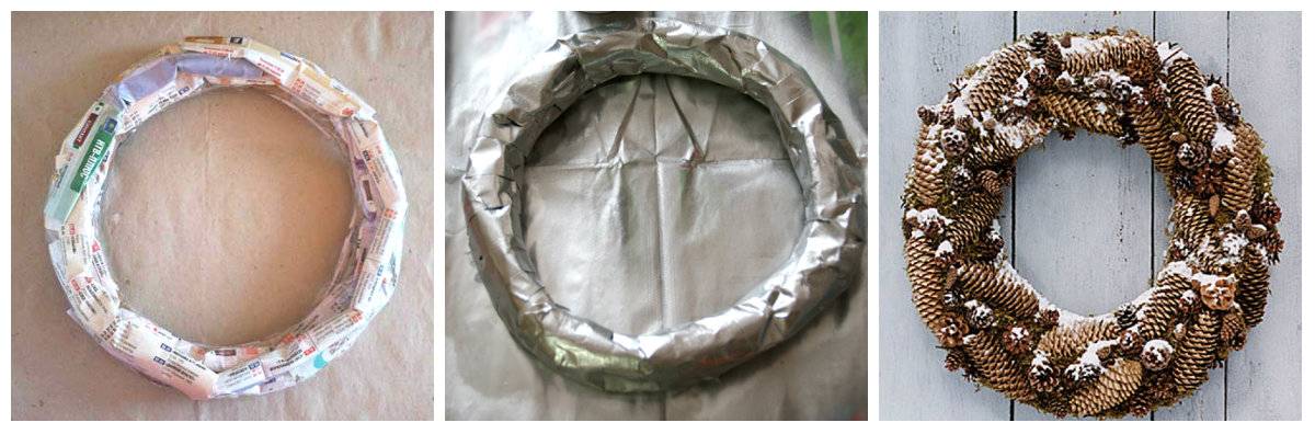 Рождественский венок из еловых шишек изготавливается по той же схеме, что и другие венки. В качестве основы для такого венка лучше использовать широкое кольцо из пенопласта или картона и газет, шишки лучше крепить с помощью клеевого пистолета. Готовый венок можно украсить искусственным снегом, распылив его из баллончика.