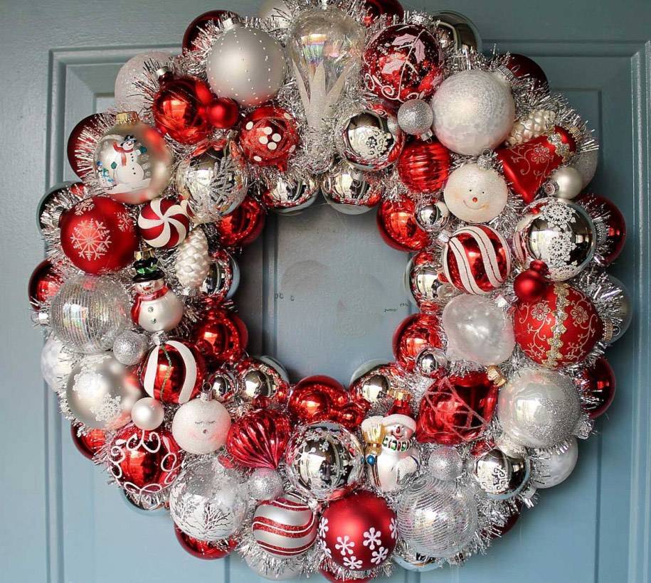 Традиционный рождественский или новогодний венок используется для праздничного декора интерьера. Самым простой способ сделать подобный венок — обернуть картонное кольцо новогодним дождиком или нанизать новогодние шары на проволоку и сомкнуть ее в кольцо.