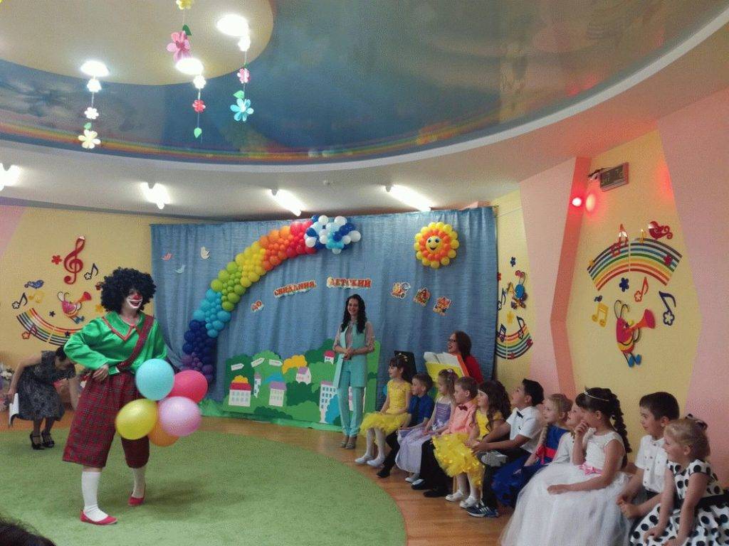Мы часто оформляем детские сады шарами, вариантов может быть очень много. Иногда все начинается с входной калитки, главного входа, коридора и лестничного пролета. В зале, само-собой, тоже много украшений. Больше всего элементов на сцене и боковых стенах.