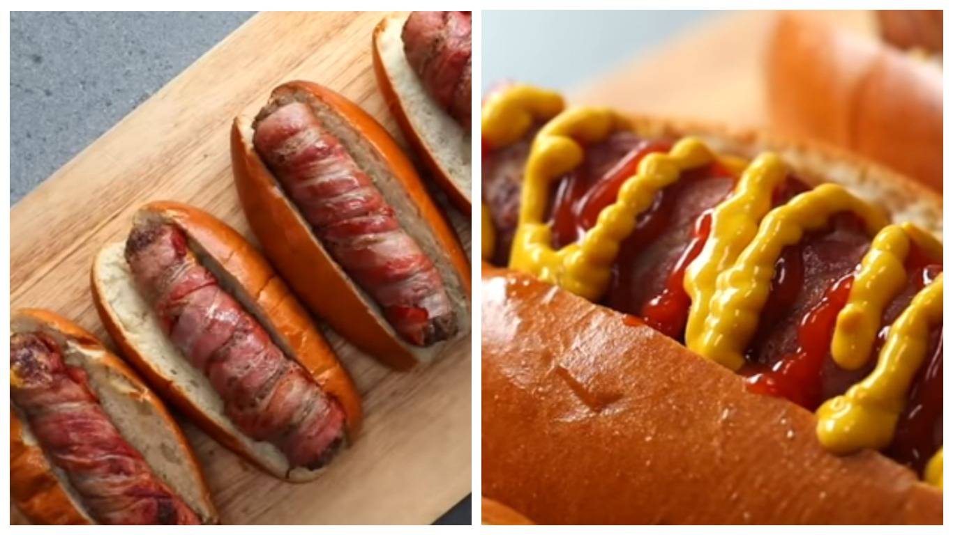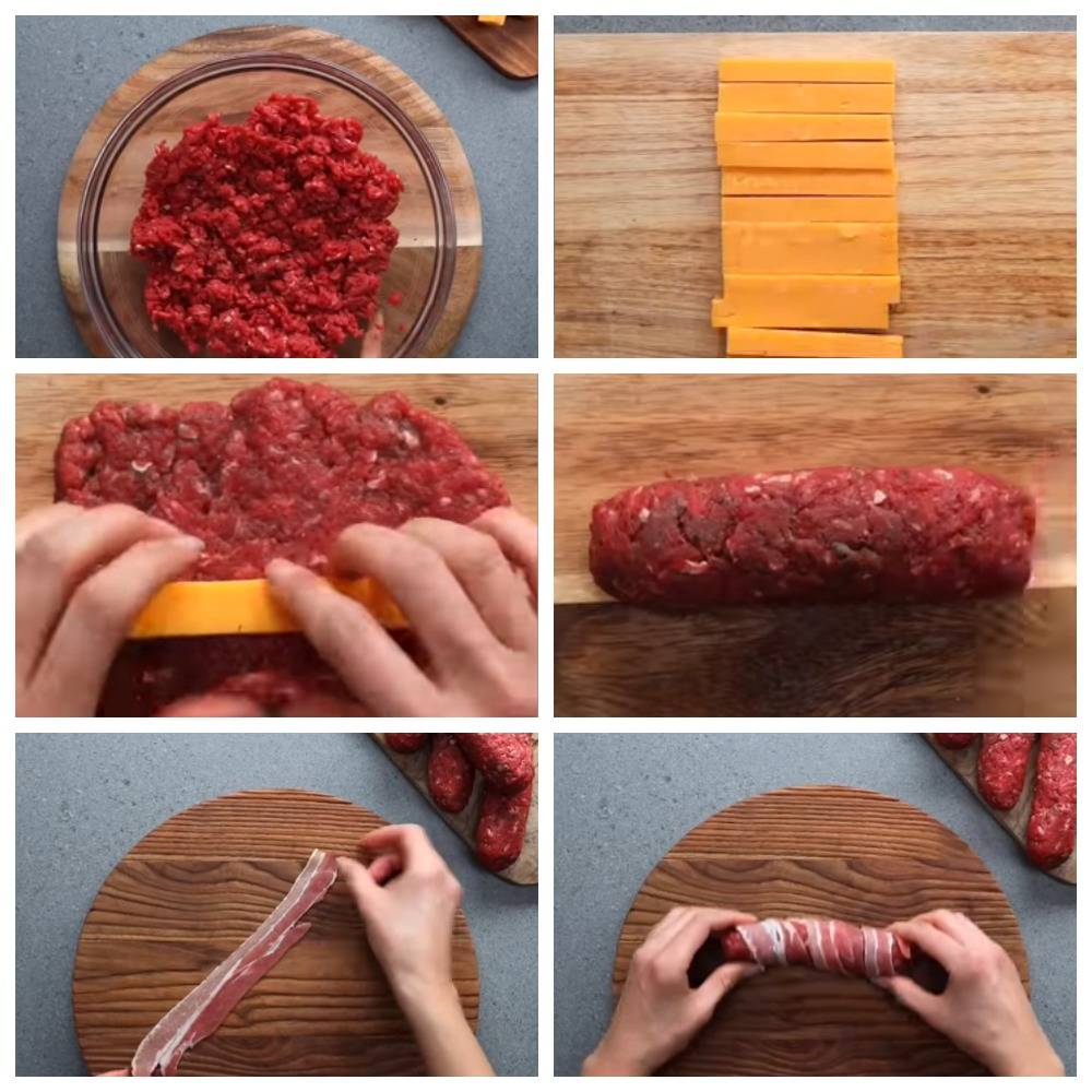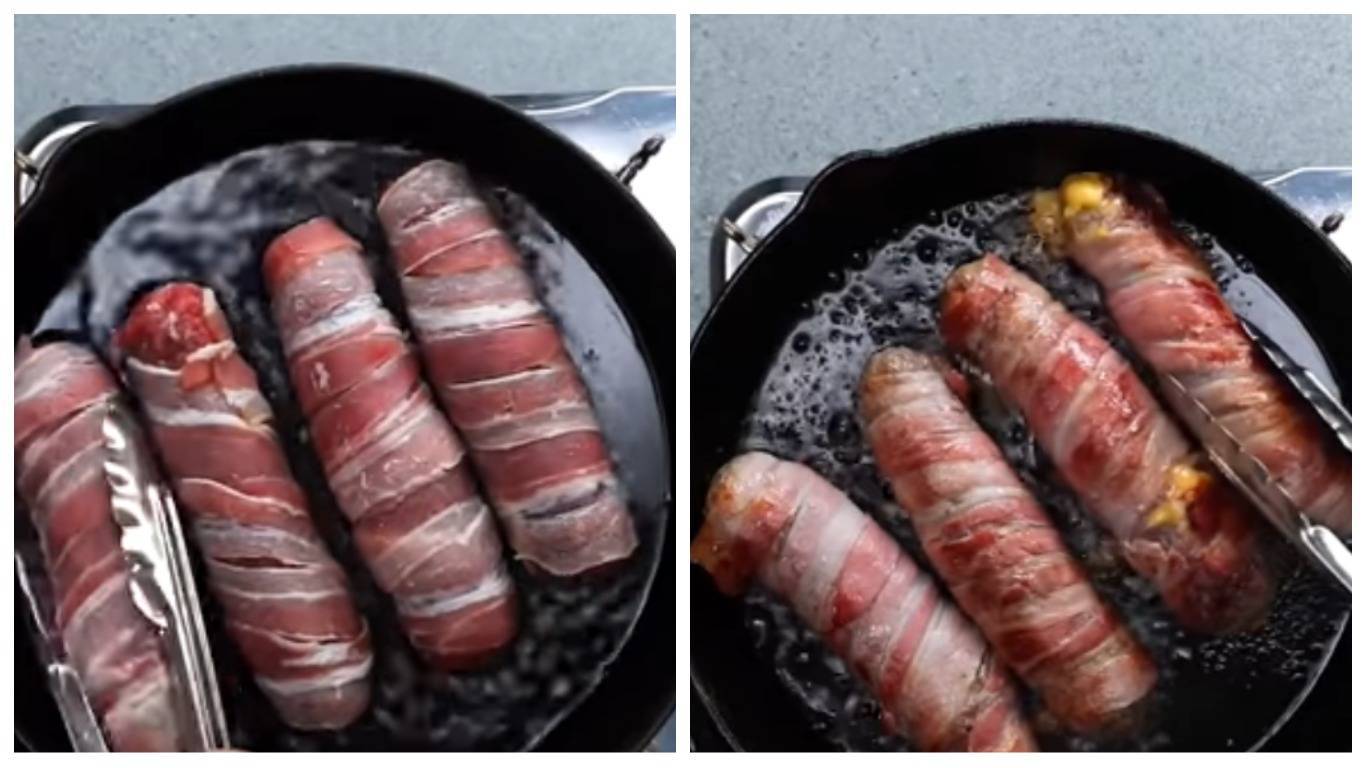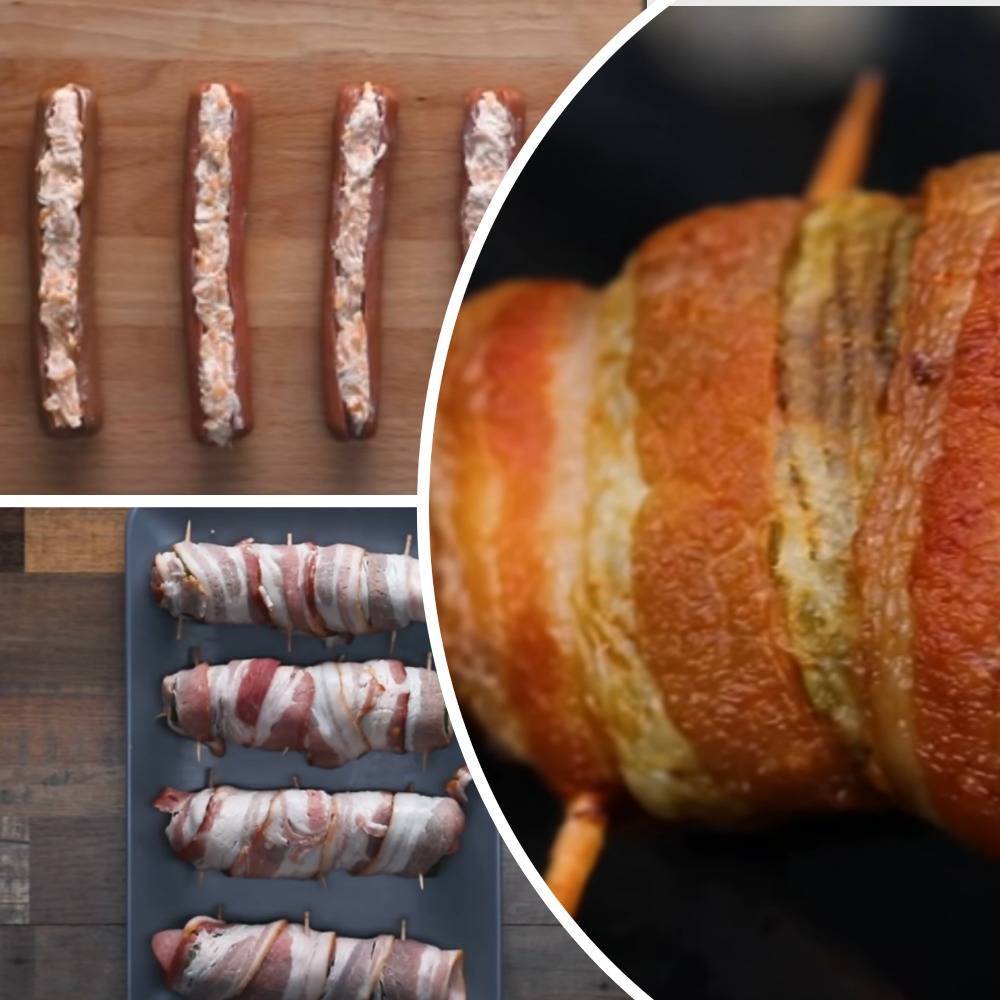 - Разрез смазать горчицей и вставить в него сыр, обмотать беконом каждую сосиску.