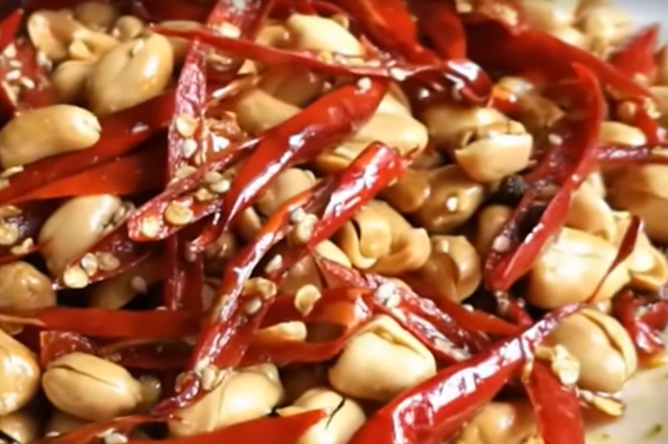 Перец чили нарежьте длинными полосками. Не хотите слишком острой жгучести? Не используйте семена. Нарезку обжарьте с растительным маслом. Добавьте орехов и ложку меда. Все перемешайте. Жарьте еще 4-5 минут. Помешивайте. К столу подайте в холодном или теплом виде.