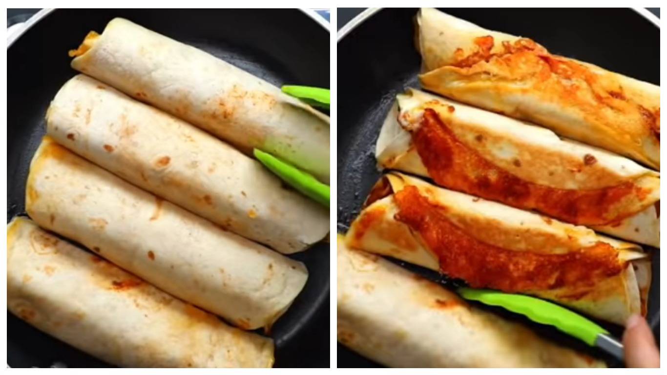 - Подрезать края лаваша до начала сосиски и разрезать рулет на 5-6 частей, каждый кружочек наколоть вертикально на шпажку и обжарить с 4 сторон на растительном масле. Когда будет поджариваться последняя сторона, посыпать закуску тертым сыром.