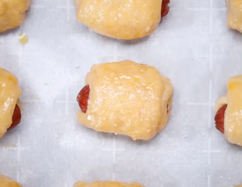 Вместо колбасы подойдёт ветчина или буженина. На готовку уйдёт не более 20 минут. Разогрев духовку до 180 градусов и смазав чистый противень, нужно приступить к следующим шагам: