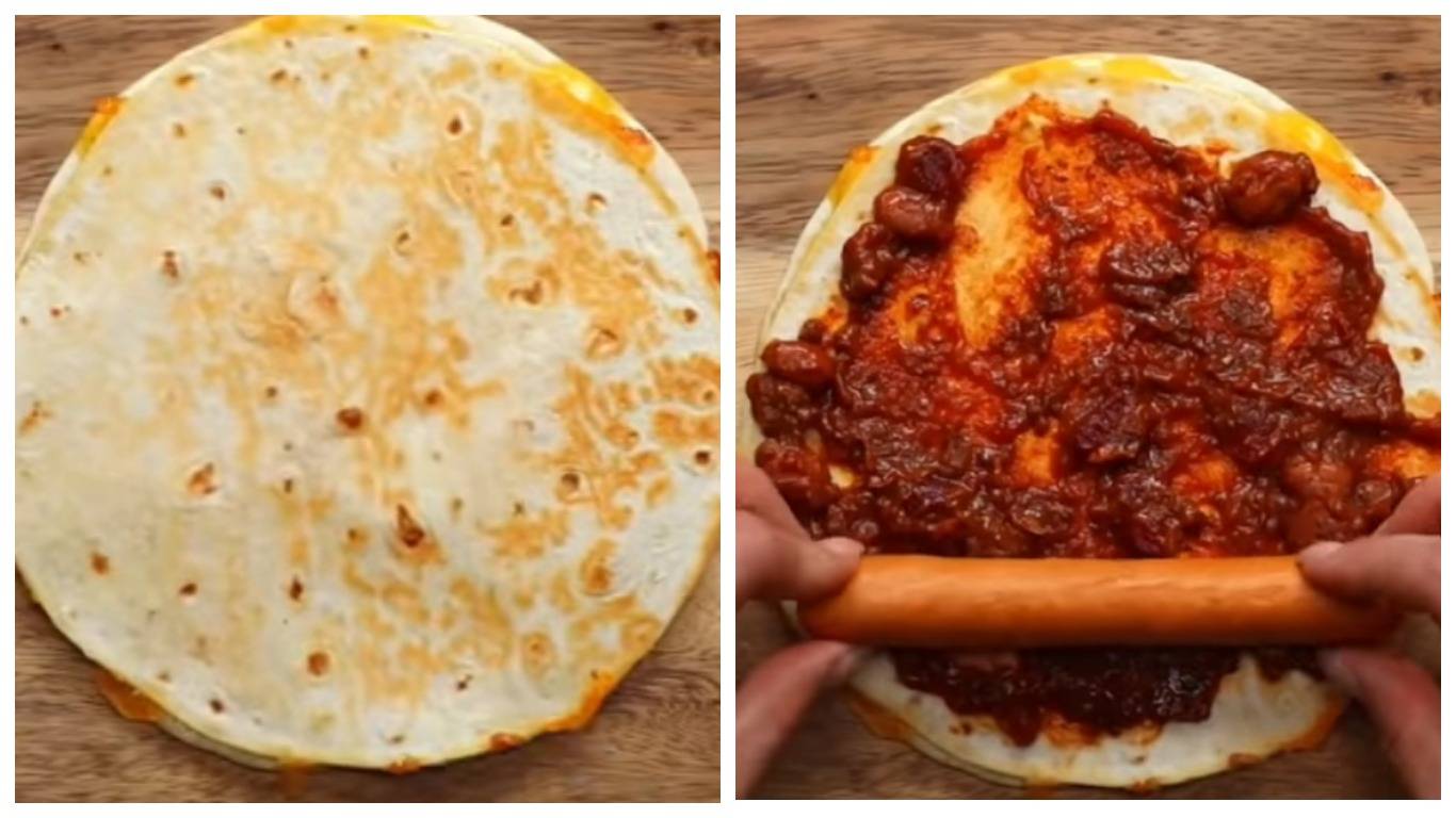 - Взять полоску лаваша и смазать ее яйцом, на 1 край вложить немного укропа, сверху поместить сосиску и скрутить в плотный рулет.