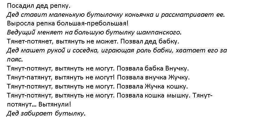 Ведущий: Ээээ, нет! Не все так просто! Давайте теперь покажем нашу сказку, выражая разны эмоции. Итак, Бабка, ты должна торопиться, тебе ведь всегда некогда. А ты, Дед, должен ходить растерянным. Внучка – лентяйка, Жучка так и норовит что-нибудь стырить. Кошка – интеллигентка и белоручка, ты не хочешь пачкать лапы. Ну а Мышка, паникерша, только ей разрешено в конце сценки орать.