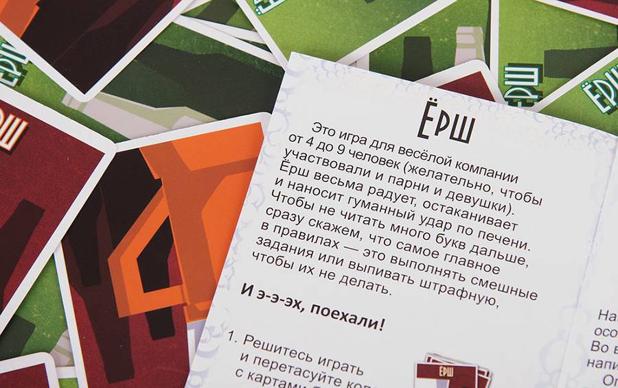Непьющие компании точно могут проходить мимо этой игры, а вот любители скрасить вечер спиртными напитками оценят Ерша по достоинству. Участвовать могут от 4 до 9 человек и обязательно старше 18 лет, так как игра завязана на алкоголе. Смысл Ерша заключается в следующем: из колоды все по очереди тянут карты, на которых написаны каверзные задания. Если вы отказываетесь выполнять выпавшее задание, то вы… пьете. Цель игры — остаться трезвым, и, поверьте, это будет задача не из легких, так как из-за некоторых заданий вы рискуете набрать тысячи просмотров в Ютубе. В итоге трезвыми остаются самые смелые, а стеснительные и стыдливые натуры напиваются. Кстати, за выполненное задание вам полагается не менее интригующий бонус — вы можете заставить любого игрока выполнить определенное действие и он не имеет права отказываться, так как этого требуют правила игры. У данной настолки есть 2 версии — классический Ерш и Ерш Баня.