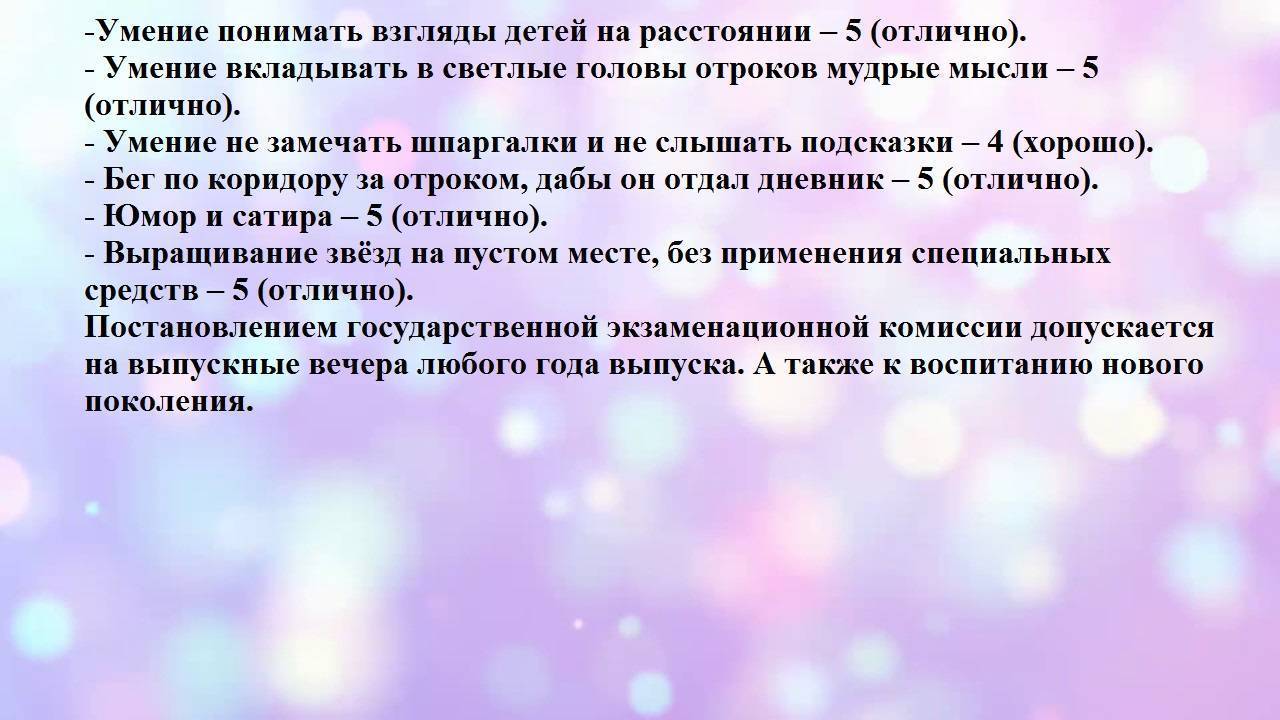Бывший выпускник: Сегодня мы хотим вручить цветы и почетный диплом нашему любимому классному руководителю (имя, отчество). Спасибо вам за помощь и участие в нашей школьной жизни! Диплом подтверждает, что у вас имеются такие знания и умения: